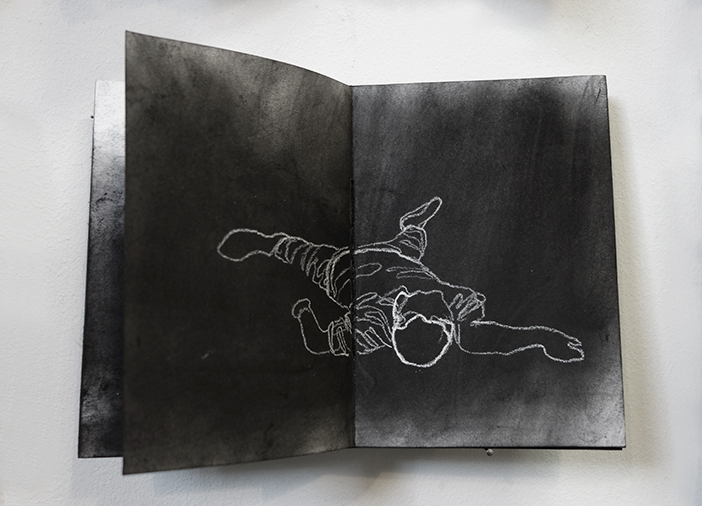 With the fallen bodies, drawn on a black background, I sought to convey the darkness, horror, and pain of so many senseless deaths. I used charcoal dust to pigment the white paper as a means to create a somber space of death. The white outline of the fallen bodies evokes a presence, almost a ghostly shadow. The notebooks installed on the wall partially reveal other bodies in their half-opened pages, a technique I’ve employed to accentuate the endless nature of this violence.